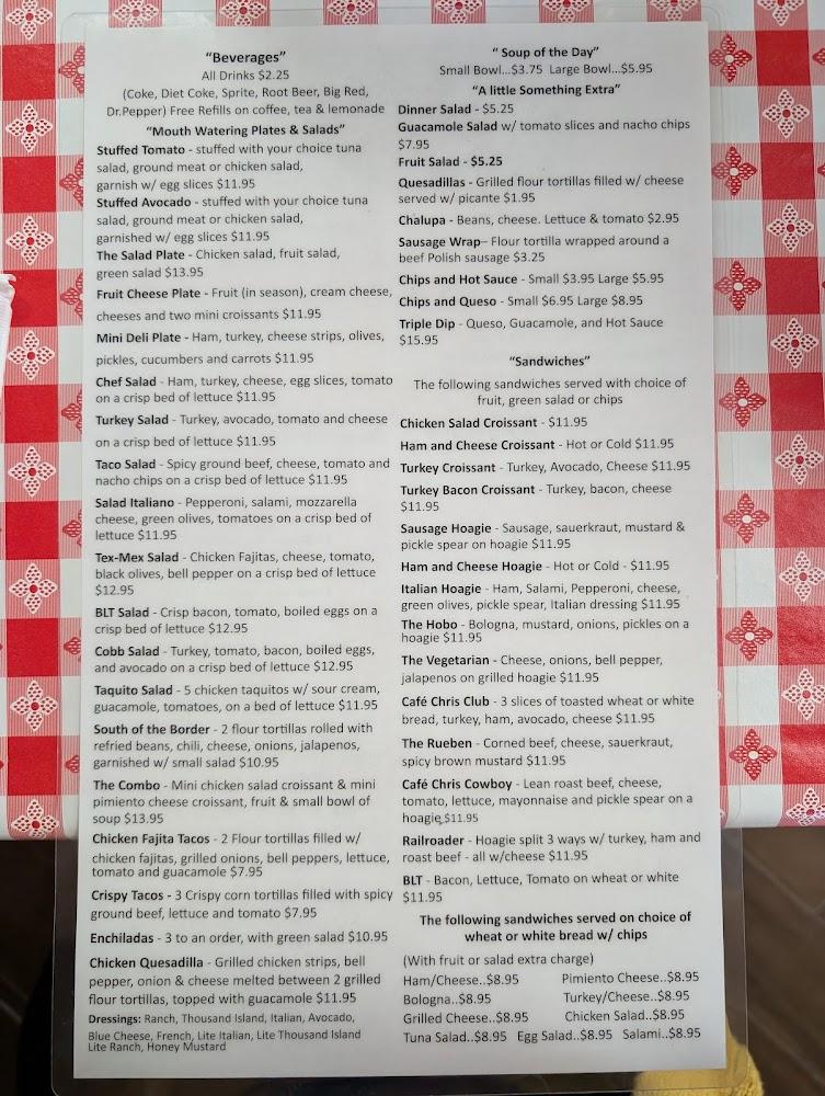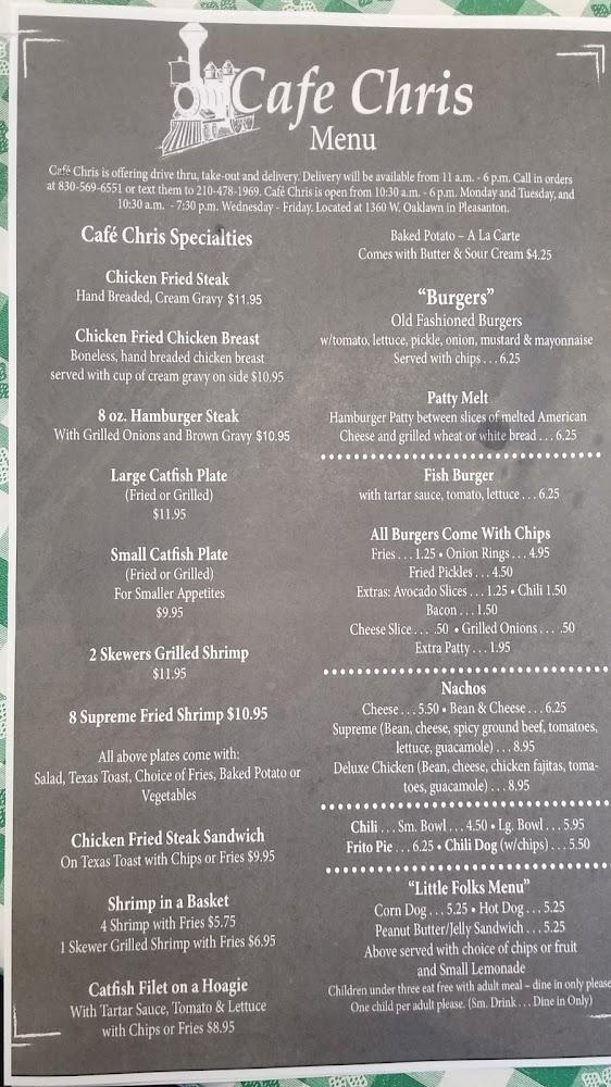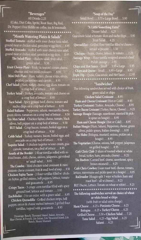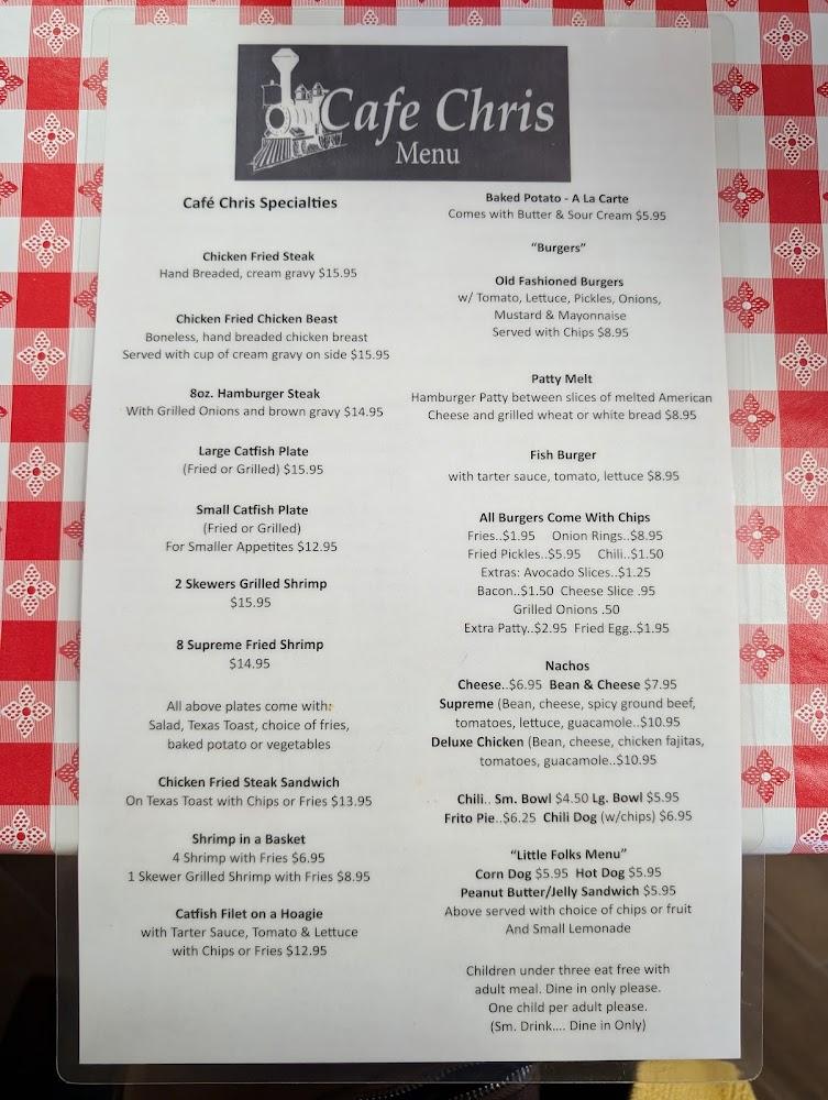 Cafe Chris boasts a diverse menu, showcasing American classics and Tex-Mex delights. Featured dishes include the chicken fried chicken beast and hearty hamburgers, each cooked to perfection. For lighter fare, the salad plates shine, offering fresh tastes. The nachos and quesadillas also please many guests.